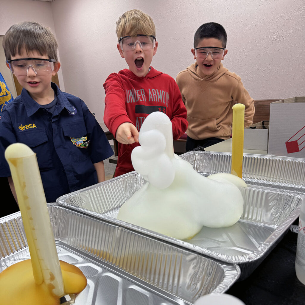 During the visit, scouts explored the concept of polymers and cross-linking chains by creating “gluep” using a borax and glue solution. They also observed the rapid decomposition of hydrogen peroxide to water and oxygen gas through its reaction with potassium iodide, producing a crowd-favorite demonstration known as elephant toothpaste.