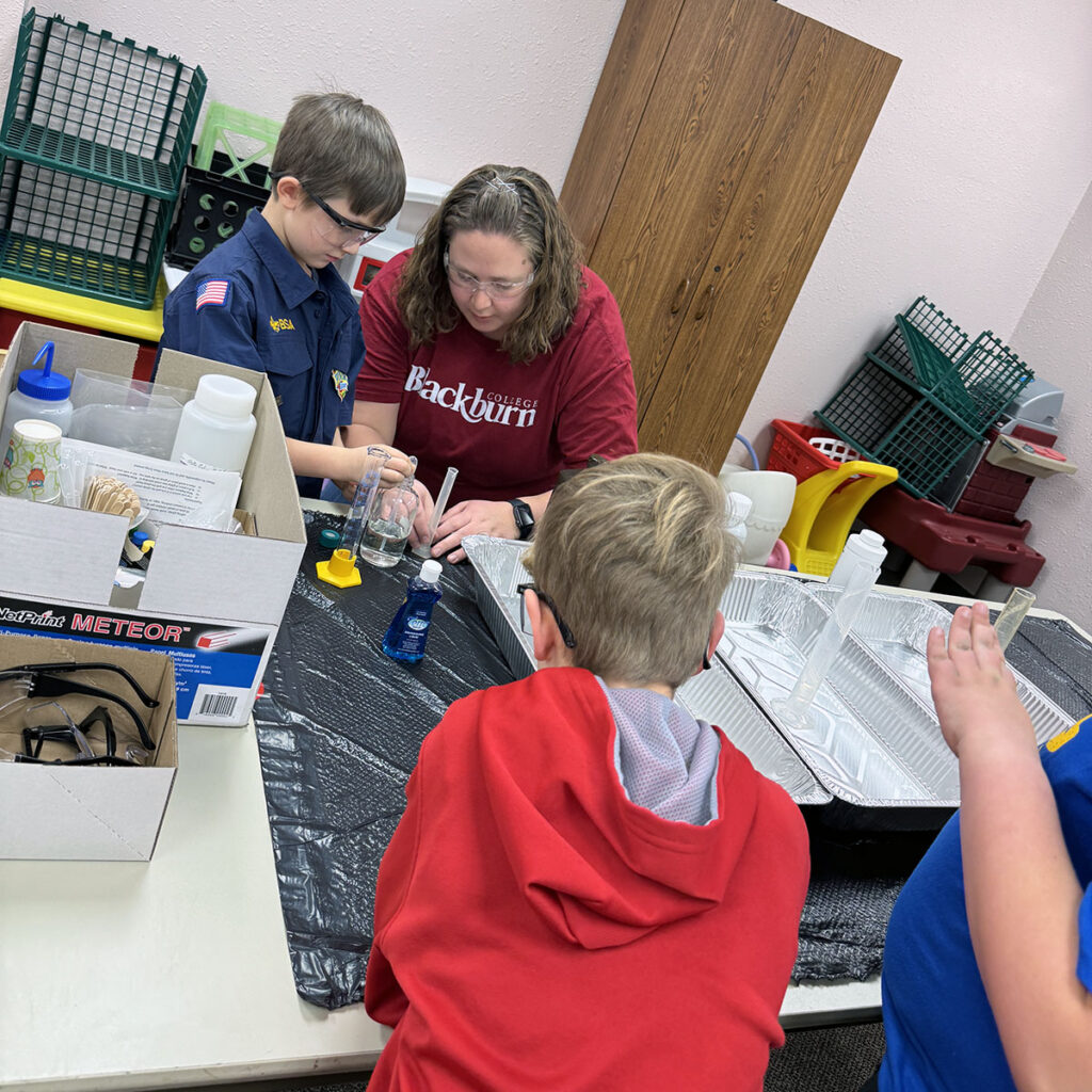 Dr. Carissa Hammann ‘10 recently visited the local Carlinville Cub Scout Pack 65, Bear Scout den meeting to lead an engaging, hands-on science lesson designed to spark curiosity and excitement about chemistry and physical science.