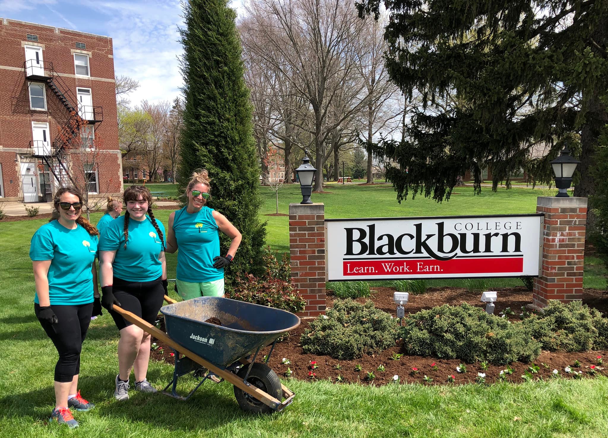 Blackburn students posing for a picture while working around the grounds near Hudson Hall.