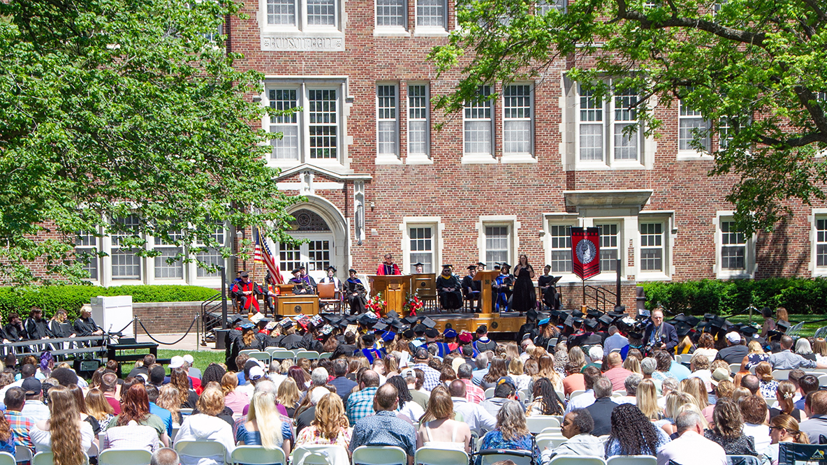 Photo of a giant crowd, Blackburn graduates seated and a full stage of administrators and guests during Blackburn College’s 155th Commencement for the Class of 2024