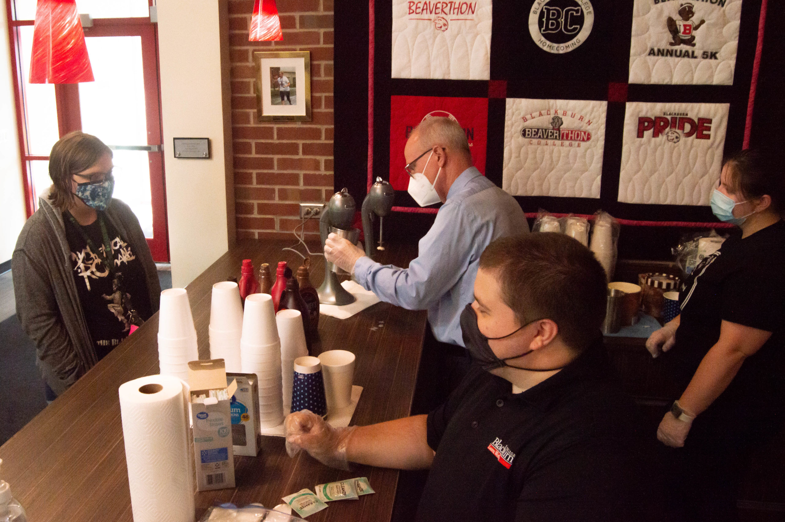 Blackburn staff members serving a milkshake to a student during Milkshake Monday.